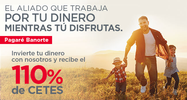 Pagaré Altos Rendimientos: GAT Nominal 8.85% GAT Real 4.56% antes de impuestos para un plazo de 60 días, calculada al 11 de Abril del 2019. Vigencia al 31 de Julio del 2019 para un monto de inversión de $250,000 pesos, para fines informativos y de comparación exclusivamente. La GAT Real es el rendimiento que obtendría después de descontar la inflación estimada. La Ganancia Anual Total (GAT) puede cambiar en función a la tasa de referencia Cetes 28 días. Inversión CD: GAT Nominal 7.57% GAT Real 3.34% antes de impuestos para un plazo de 84 días; calculada al 11 de Abril del 2019. Vigencia al 31 de Julio del 2019 para un monto de inversión de $100,000 pesos, para fines informativos y de comparación exclusivamente. La GAT Real es el rendimiento que obtendría después de descontar la inflación estimada. La Ganancia Anual Total (GAT) puede cambiar en función a la tasa de referencia Cetes 28 días. *Dinero nuevo: es el dinero que viene de fuera de la institución (validando su saldo integral). Vigencia de la promoción al 31 de julio 2019. Banorte se reserva el derecho de dar por terminada la presente promoción en cualquier momento sin previa notificación. Monto protegido 400 mil UDIS, por persona por Institución www.ipab.org.mx En Banorte Móvil para usuarios Telcel, no aplican costos por uso de datos. Aplican restricciones. Producto operado por  Banco Mercantil del Norte S.A., Institución de Banca Múltiple, Grupo Financiero Banorte. Términos, condiciones, comisiones, requisitos de contratación y detalles de la promoción en banorte.com;  Tasa anual  bruta. Tasas expresadas antes de impuestos.